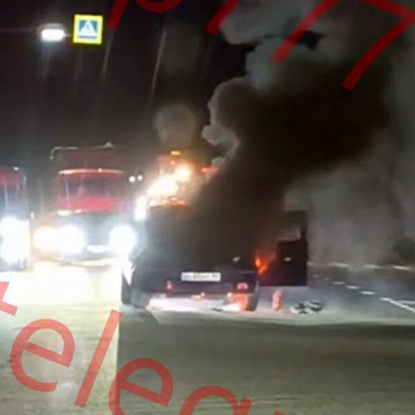 На кадрах видно, что от стоящего посреди проезжей части автомобиля поднимается густое облако дыма, а из салона вырываются языки пламени. Рядом с автомобилем находится мужчина, который пытается сбить пламя из огнетушителя. Движение рядом с пожаром не перекрыто, мимо горящей машины проезжают другие автомобили.