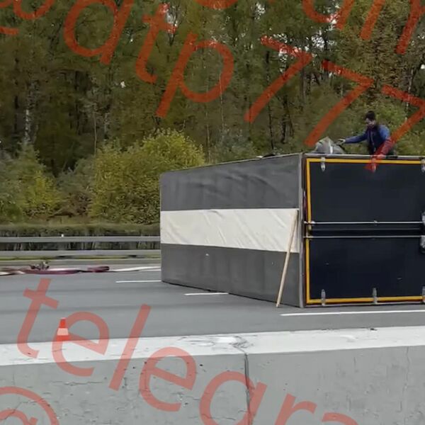 Завалившийся на бок грузовик перекрыл несколько полос на МКАД в Москве. Кадры опубликовал Telegram-канал «ДТП и ЧП МОСКВА и МО».