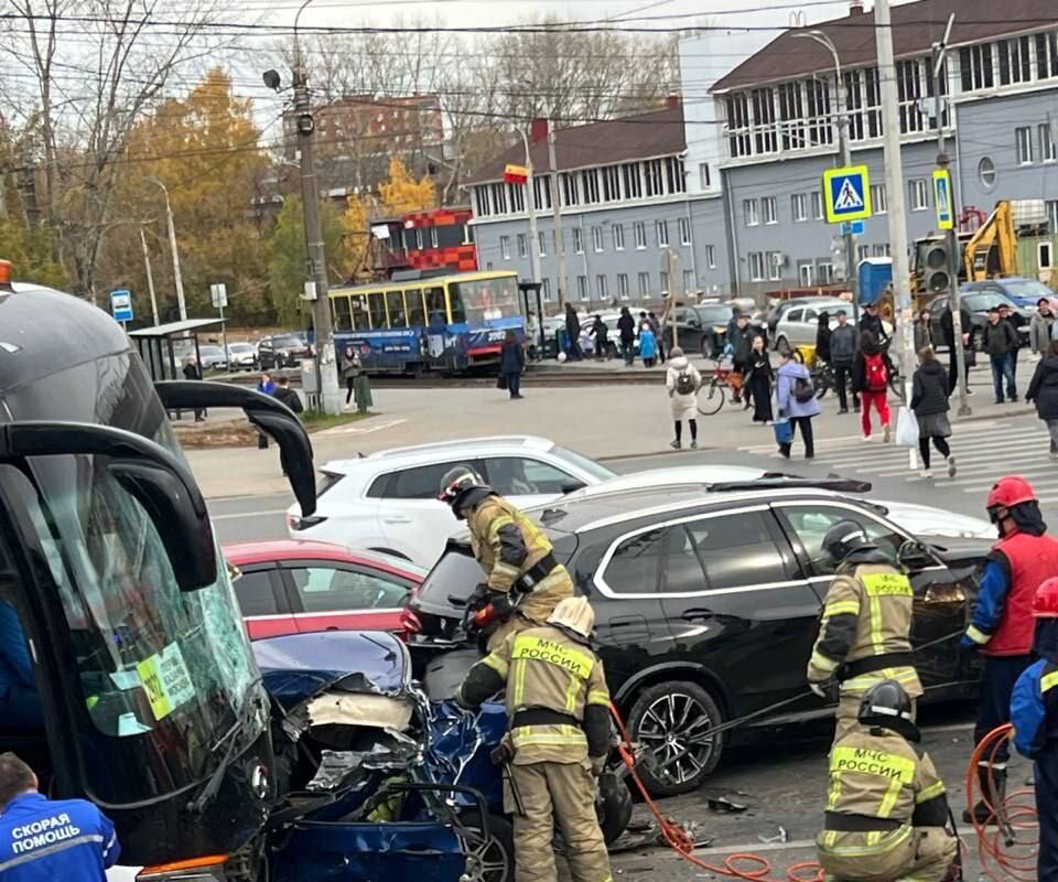 «Все произошло на пересечении Удмуртской и улицы Кирова: столкнулись рейсовый автобус «Казань-Пермь» и три легковых автомобиля. Предварительно, одна из машин влетела в пешеходов», — говорится в сообщении.