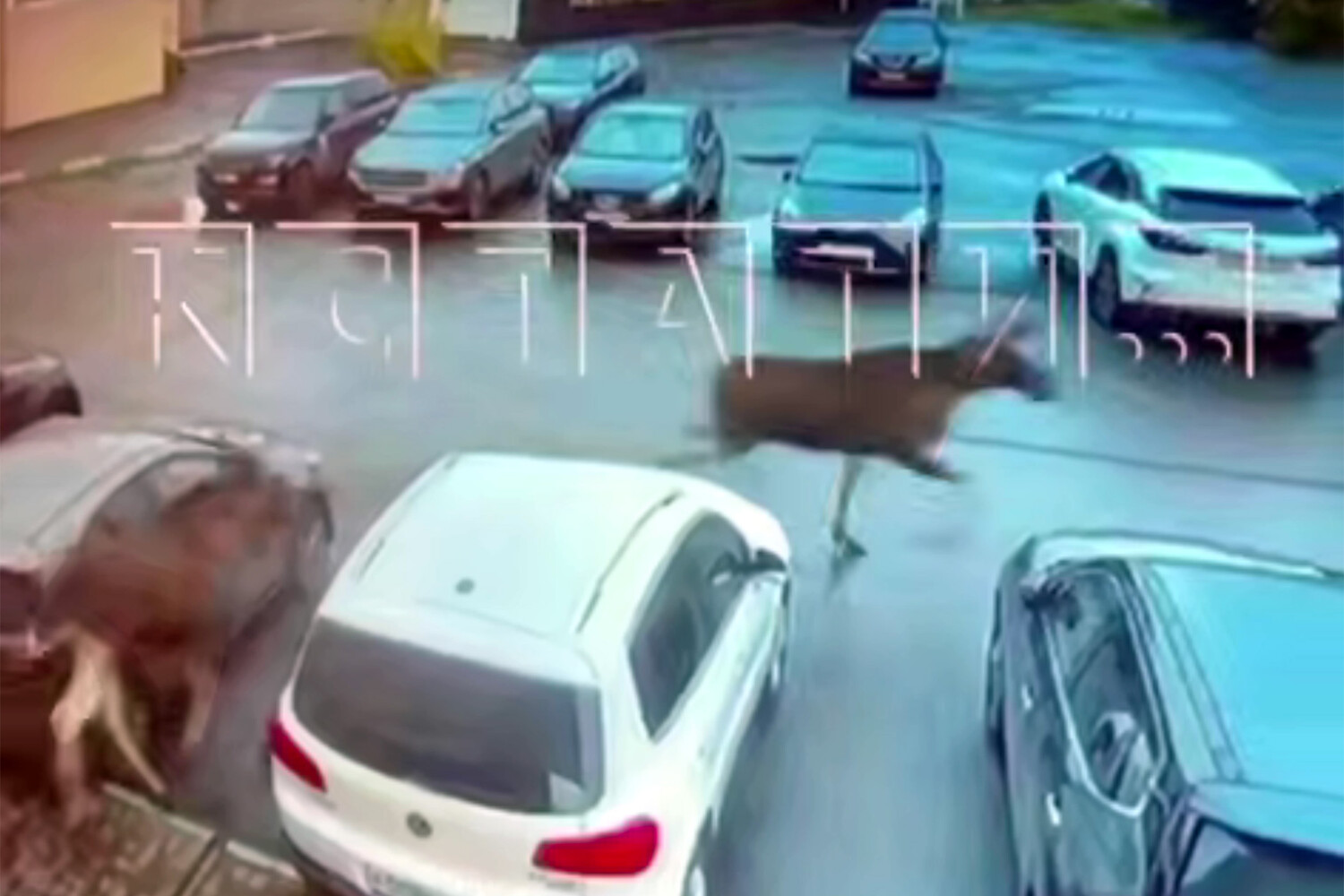 Уличная камера запечатлела инцидент. На кадрах видно, как животные бегут по парковке, при этом они возвращаются, проходят мимо машин и снова убегают.
