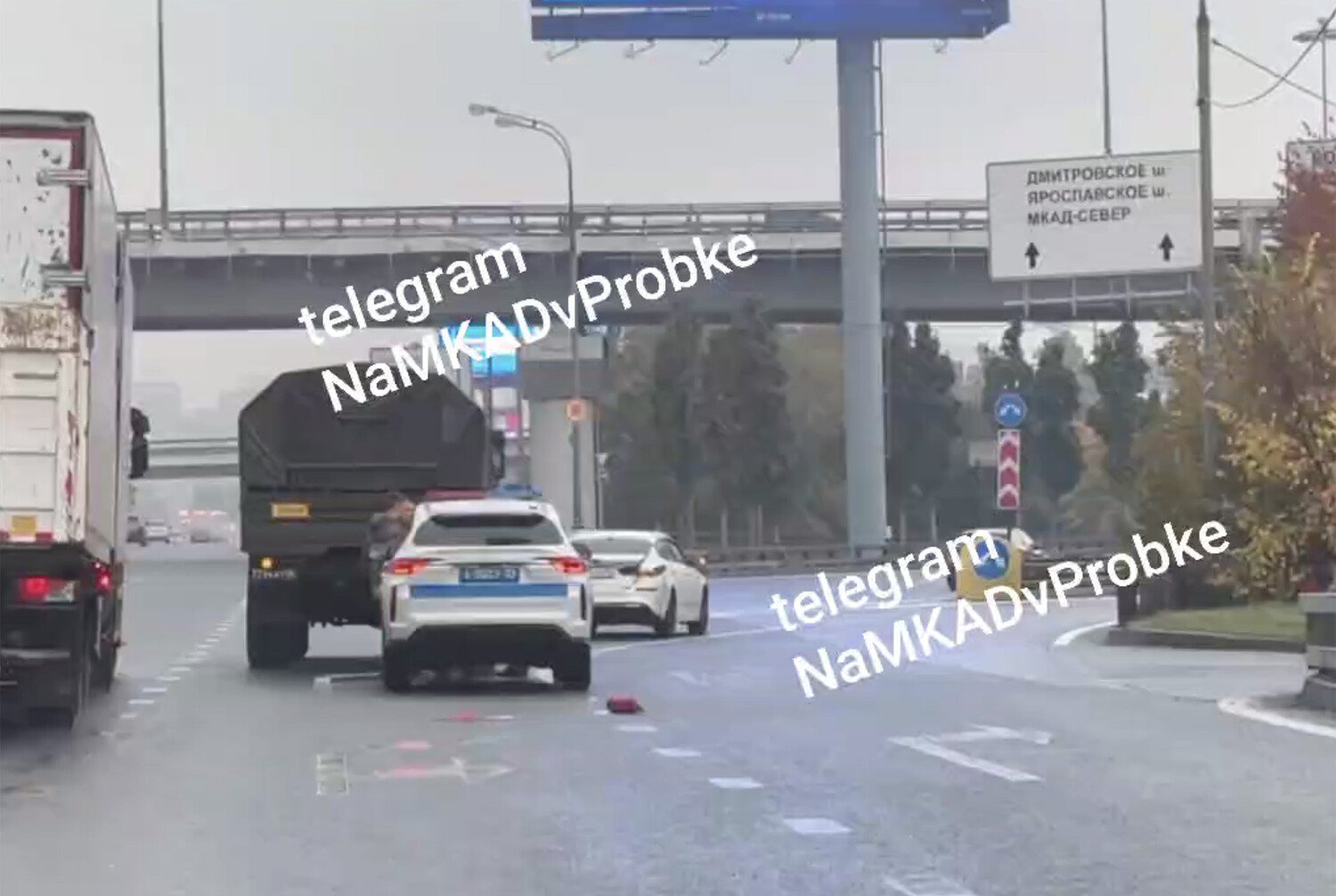 На развязке Ленинградского шоссе и МКАД произошло ДТП с участием военного грузовика и седана Kia K5. Видеозапись с последствиями инцидента опубликовал Telegram-канал «На МКАДе ДТП Москва».