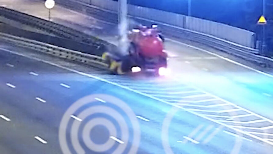Авария на 76-м километре МКАД произошла 30 августа. На кадрах с камер видеонаблюдения видно, что водитель автоцистерны включил правый поворот и начал съезжать на развязку, однако не завершил маневр. Грузовик врезался в отбойник, проскользил вдоль столба и опрокинулся на проезжую часть.