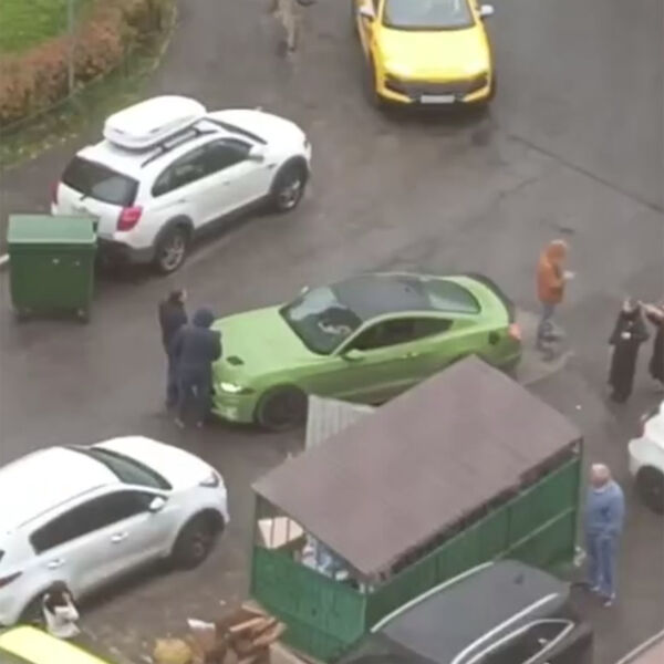 Очевидцы запечатлели инцидент. На кадрах видно, как мужчины стоят перед зеленым автомобилем, тем самым блокируют проезд.
