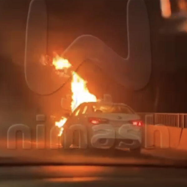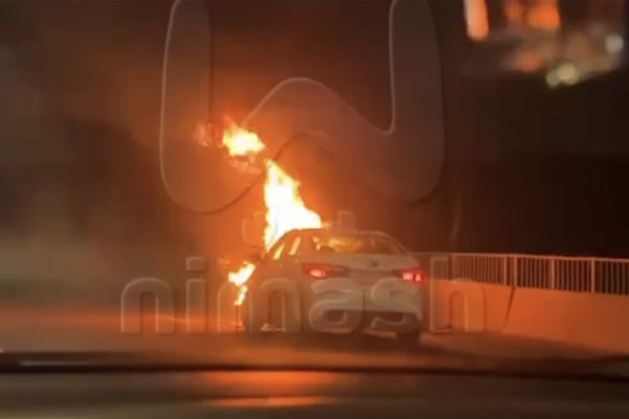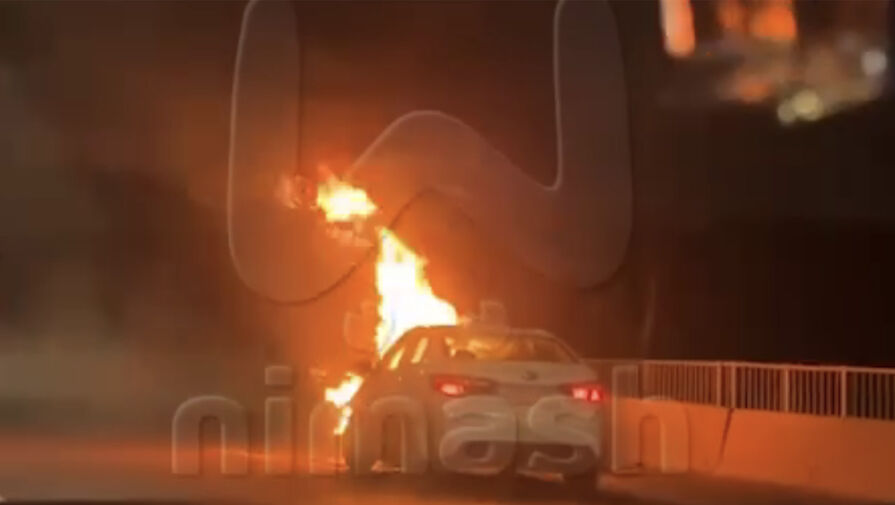 Очевидцы запечатлели инцидент на видео. На кадрах видно, что на обочине дороги горит белый автомобиль, при этом пламя охватило переднюю часть транспорта.