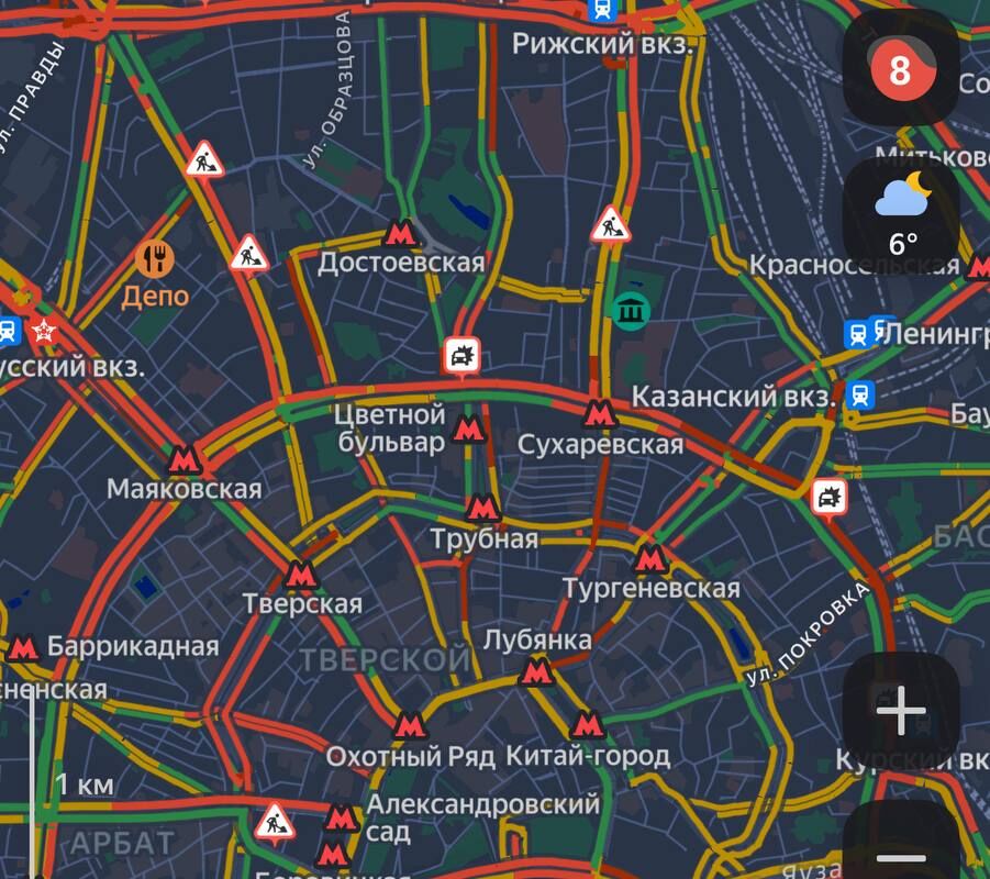 «В Москве вечерние пробки достигли 8 баллов», — говорится в публикации.
