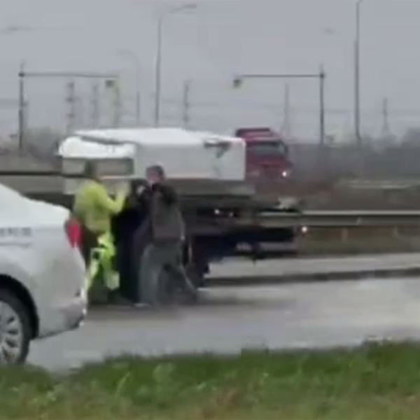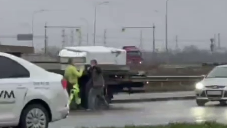 Очевидцы запечатлели инцидент на видео. На кадрах заметно, как двое мужчин дерутся на проезжей части воле припаркованного большегруза. Водители наносят друг другу удары, при этом возле конфликтующий проезжает много автомобилей.