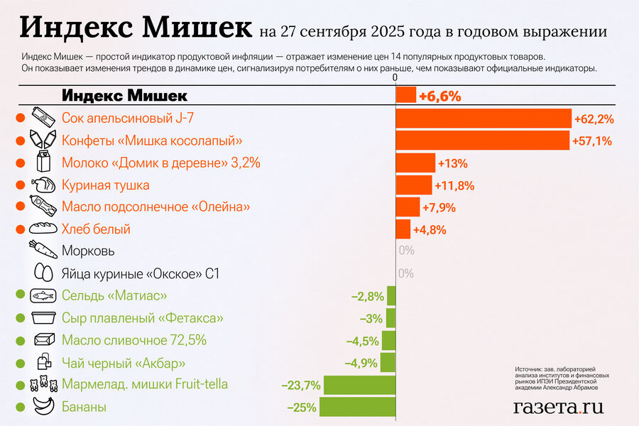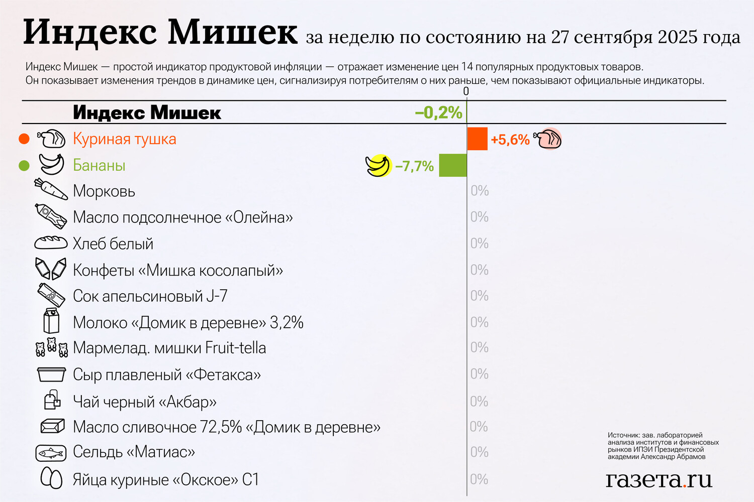 «За неделю значение Индекса Мишек снизилось на 0,2% по сравнению с его ростом на 0,2% неделю назад. Куриные тушки подорожали на 5,6%. Цены на остальные товары из Индекса не изменились. В годовом выражении значение Индекса Мишек выросло на 6,6% по сравнению с его увеличением на 6,9% неделей ранее», — отметил Абрамов.