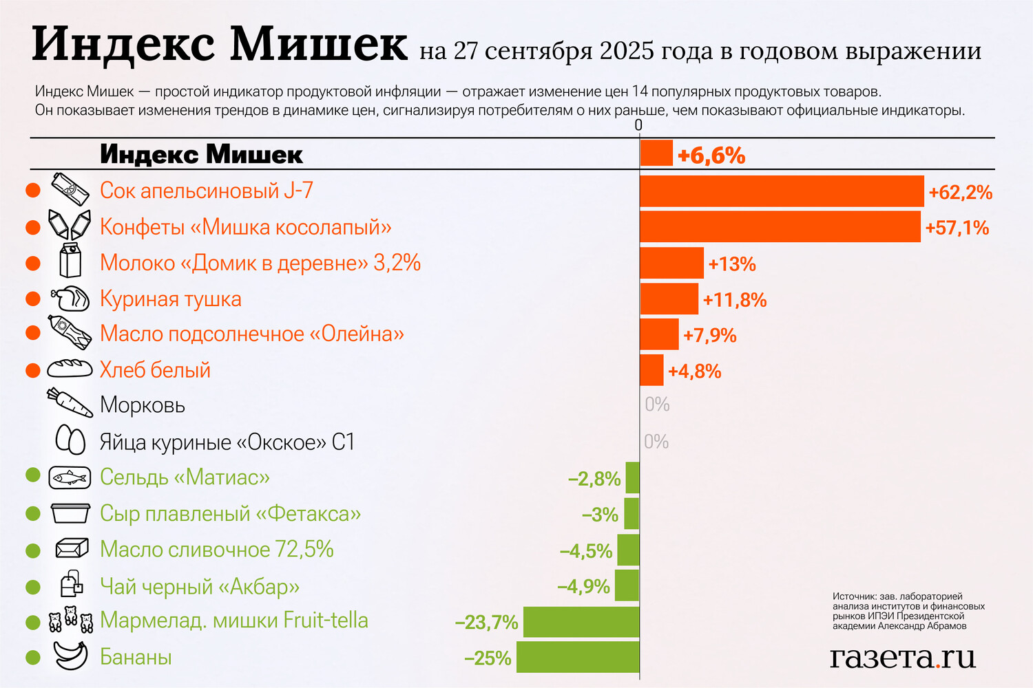 За год подорожали на апельсиновый сок J7 (+62,2%), конфеты «Мишка косолапый» (+57,1%), молоко «Домик в деревне» 3,2% жирности (+13,0%), куриные тушки (+11,8%), масло подсолнечное «Олейна» (+7,9%) и белый хлеб (+4,8%).