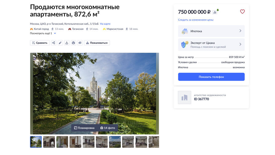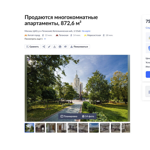 Как уточняется, в здании по адресу Котельническая набережная, 1/15кБ, возведенном в 1953 году, можно приобрести недвижимость общей площадью 872,6 кв. м. Она включает десять квартир с четвертого по восьмой этажи, три совмещенных и семь раздельных санузлов и 20-метровую кухню.