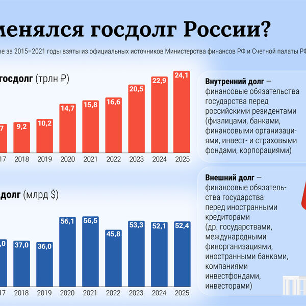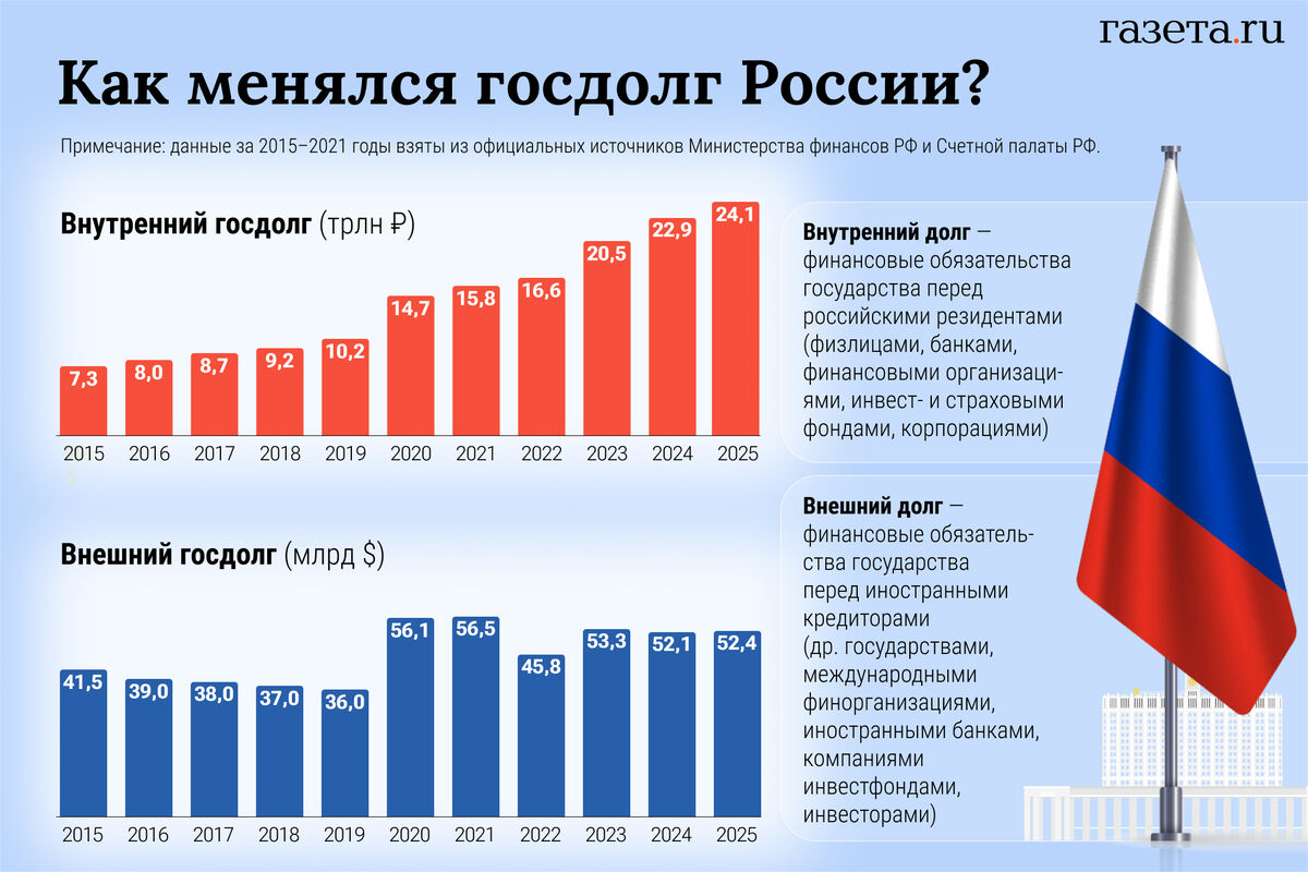 Что было бы в случае «долгового удушения» в России? По словам Трепольского, чтобы привлекать деньги для финансирования большого долга, государство вынуждено повышать ставки по своим облигациям. Это приводит к росту стоимости кредитов для населения (ипотека, потребительские кредиты) и бизнеса, сказал эксперт. Он добавил, что значительная часть бюджета уходит на обслуживание долга. Это означает, что меньше денег остается на образование, здравоохранение, инфраструктуру и пенсии, подчеркнул эксперт. По его мнению, в крайнем случае для обслуживания долга государство может начать денежную эмиссию (печатать деньги), что неизбежно ведет к ускорению инфляции и обесцениванию сбережений граждан. Трепольский заключил, что долговая нагрузка подрывает доверие инвесторов к экономике, и это снижает приток прямых иностранных инвестиций, а, значит, также создание новых рабочих мест и рост зарплат.