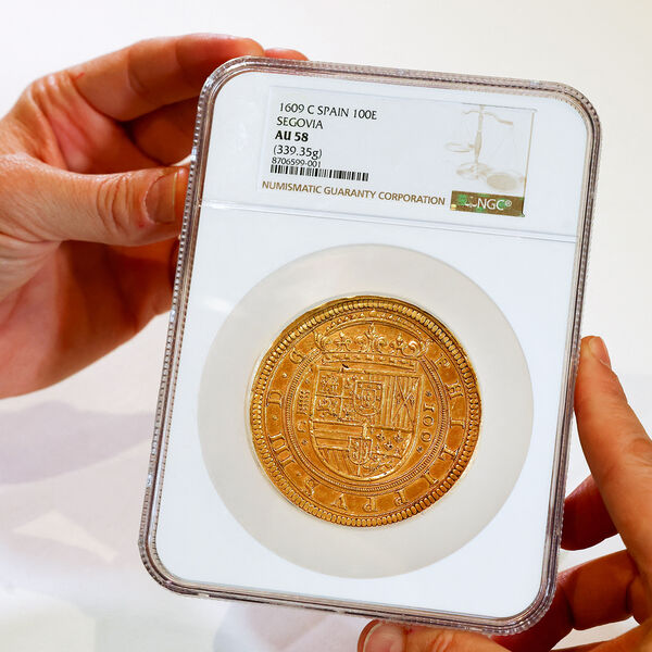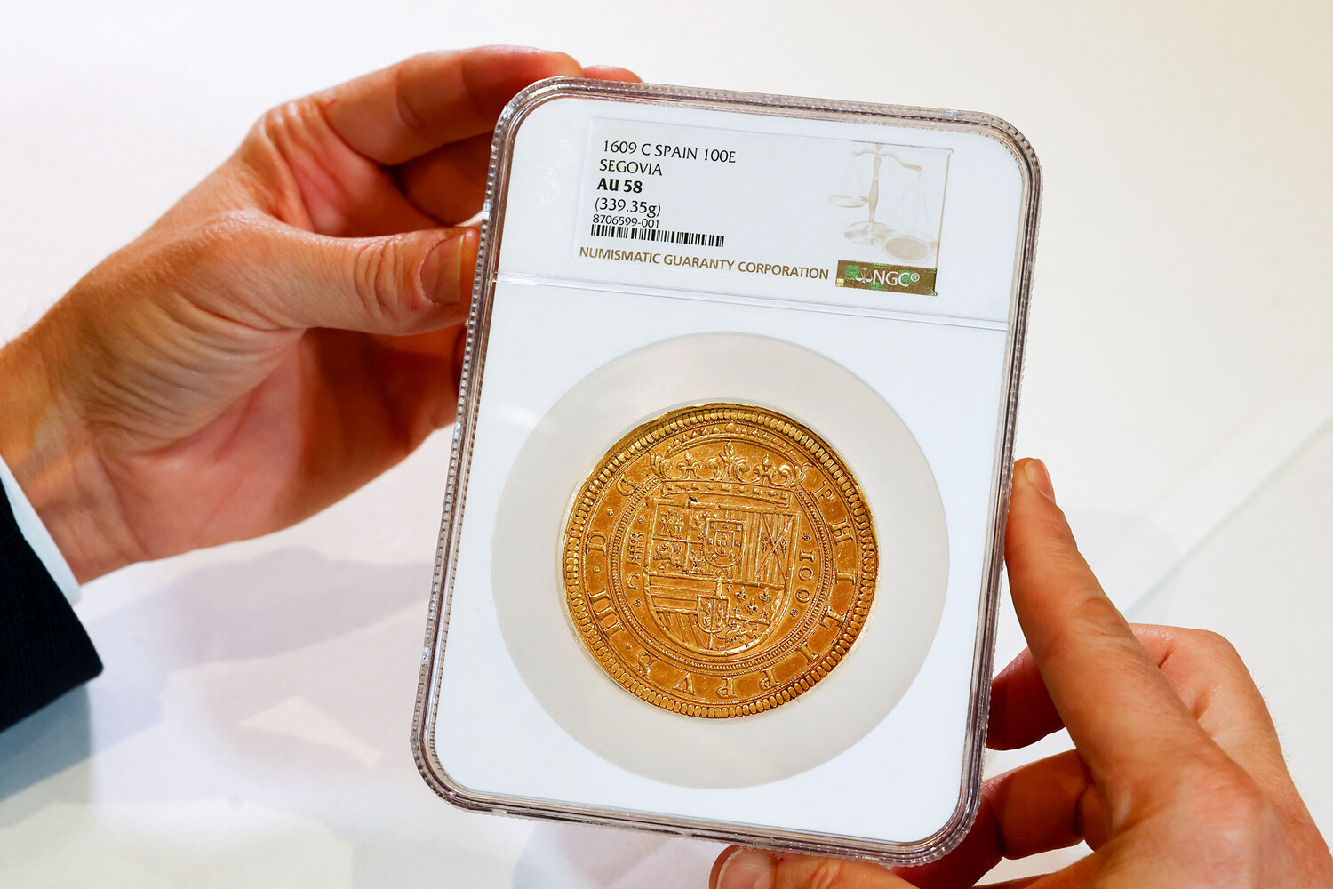 Торги проходили в Женеве. Проданная монета была первой в истории Испании монетой номиналов в сто эскудо и была отчеканена в 1609 году. Вес монеты составляет 339 г — это самая крупная монета, отчеканенная испанской короной за весь семнадцатый век. Историки отмечают, что данная монета была создана в единственном экземпляре и предназначалась не для торговли, а для демонстрации престижа короны. На монете изображены гербы Кастилии и Леона, Арагона, Португалии, Австрии, Бургундии, Брабанса и других территорий.