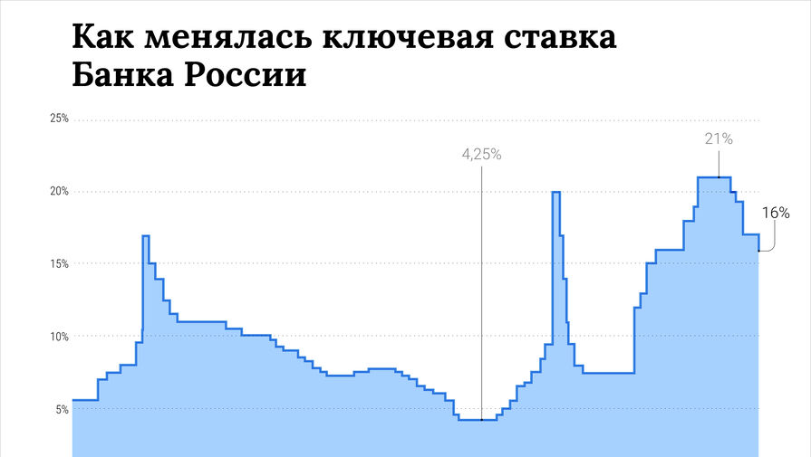 ЦБ в 2025 году снизил ключевую ставку на 5 процентных пунктов: с 21 до 16%. Это происходило на пяти заседаниях подряд.