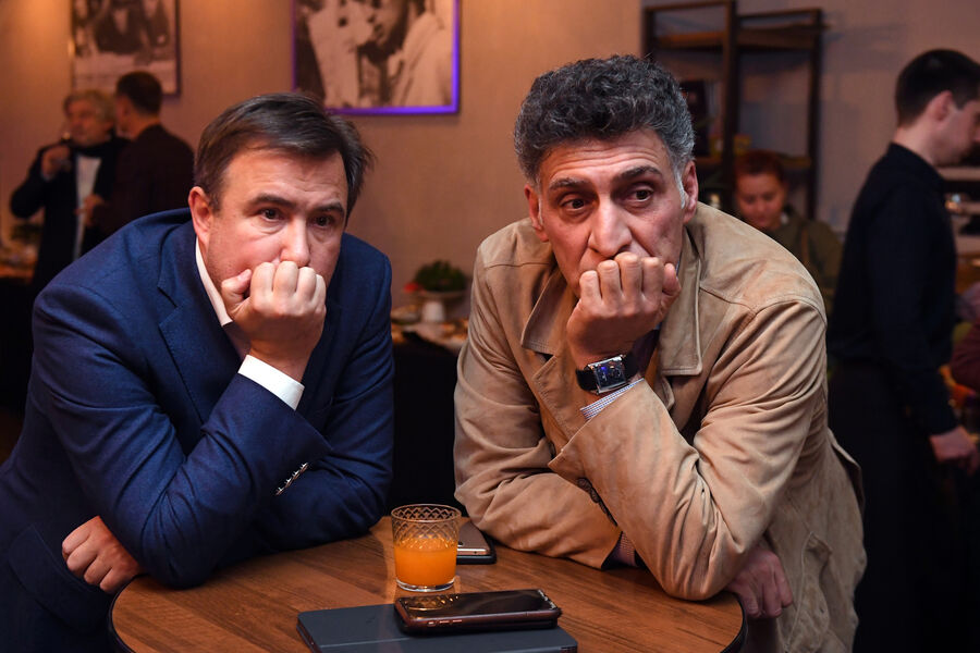 Генеральный директор АО «Телекомпания НТВ» Алексей Земский (слева) и режиссер Тигран Кеосаян перед презентацией сборника рассказов «Черные глаза» главного редактора телеканала RT и МИА «Россия сегодня» Маргариты Симоньян в Bolshevik Event Hall в Москве, 2019 год