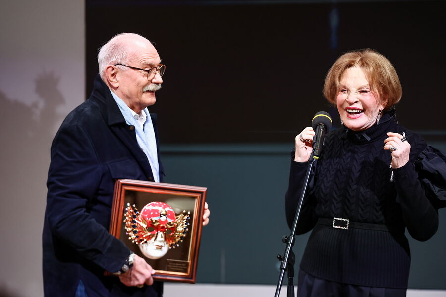 Кинорежиссер Никита Михалков вручает актрисе Людмиле Максаковой премию за выдающийся вклад в развитие театрального искусства России на церемонии вручения театральной премии «Золотая маска», 2025 год