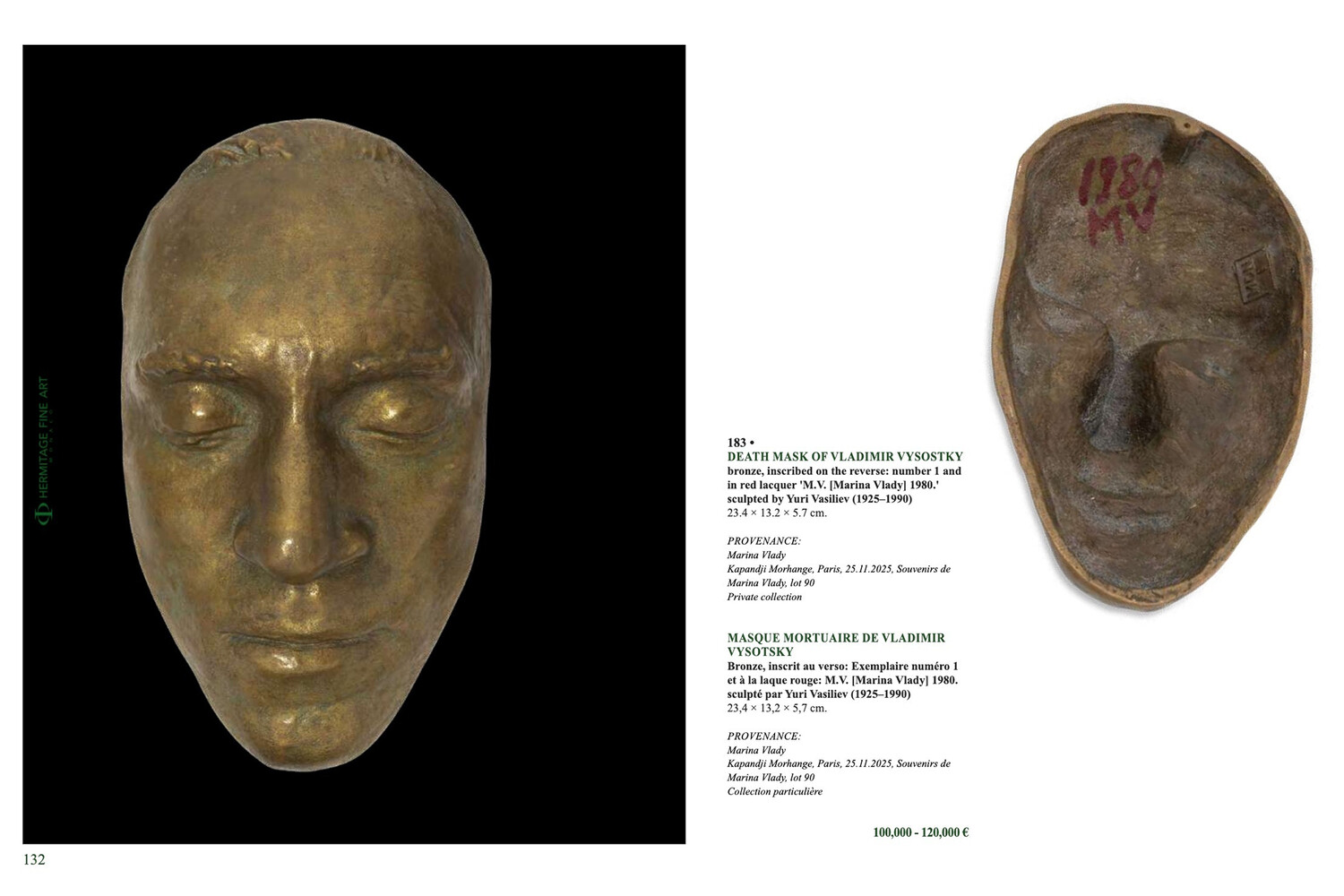 Посмертная маска отлита из бронзы в 1980 году под руководством вдовы Высоцкого Марины Влади. На коллекционный предмет нанесены инициалы Влади и год создания. Оригинальную гипсовую маску изготовил советский скульптор Юрий Васильев.