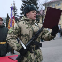 В Росгвардии добавили, что принятие военной присяги началось с выноса Государственного флага РФ, Боевого знамени дивизии и исполнения гимна России. После новобранцы поочередно выходили из строя и читали вслух текст военной присяги.