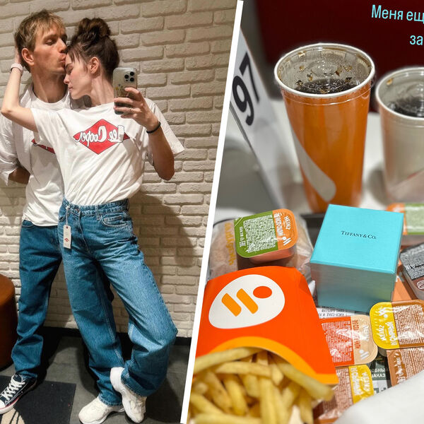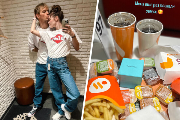 Звезда «Триггера» Ангелина Стречина призналась, что ее позвали замуж в ресторане «Вкусно – и точка». Она похвасталась очередным предложением от своего супруга, показав коробку от ювелирного бренда Tiffany & Co среди заказанных блюд фастфуда.