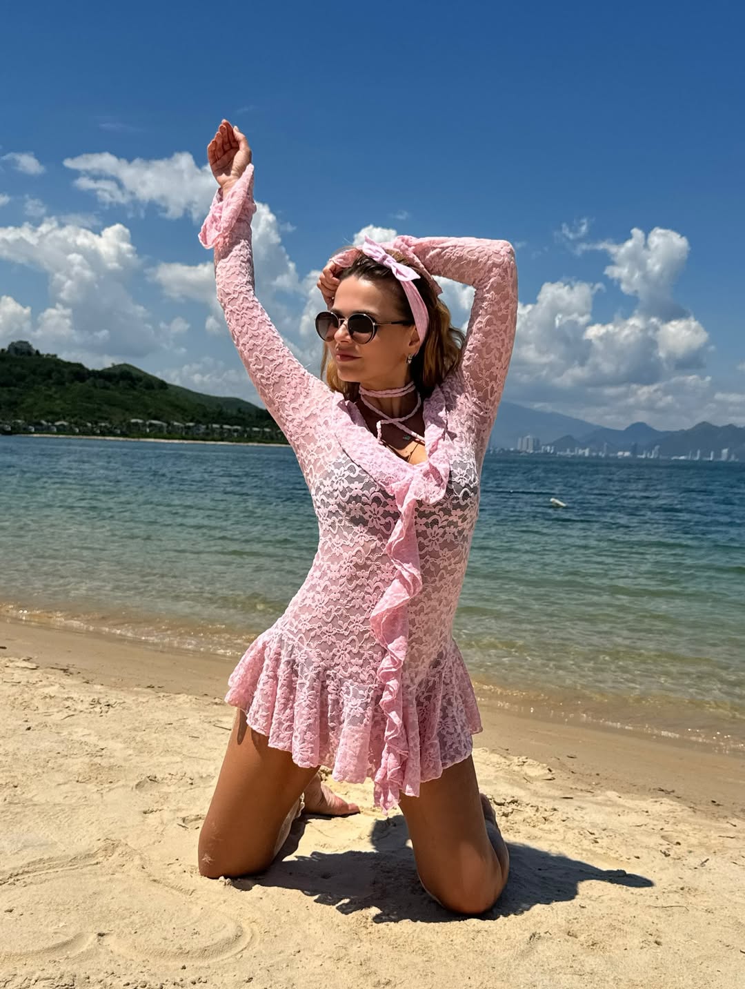 Певица Ксения Новикова снялась в полупрозрачном кружевном платье на пляже