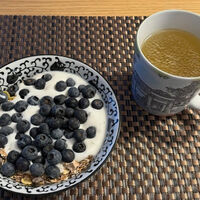 На снимке можно увидеть мюсли с йогуртом и черникой, а также кружку с напитком.