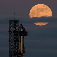 Космический корабль нового поколения Starship компании SpaceX готовится к запуску с космодрома Бока-Чика в Браунсвилле на фоне Бобровой луны — последнего суперлуния в году, 15 ноября 2024 года