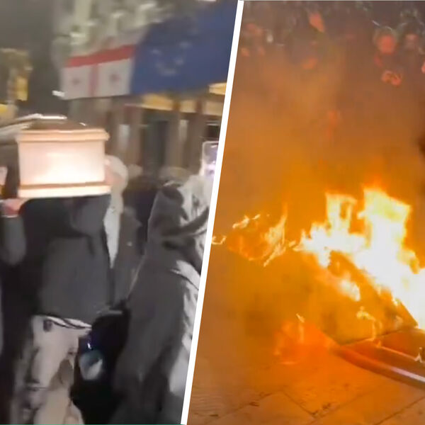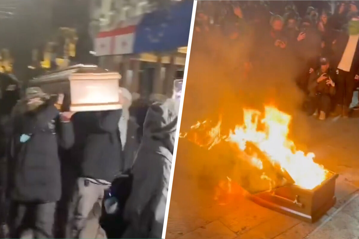 Участники акции протеста в центре Тбилиси демонстративно сожгли перед зданием парламента гроб с чучелом основателя правящей партии «Грузинская мечта», предпринимателя Бидзины Иванишвили. Об этом сообщает телеканал «Рустави 2».