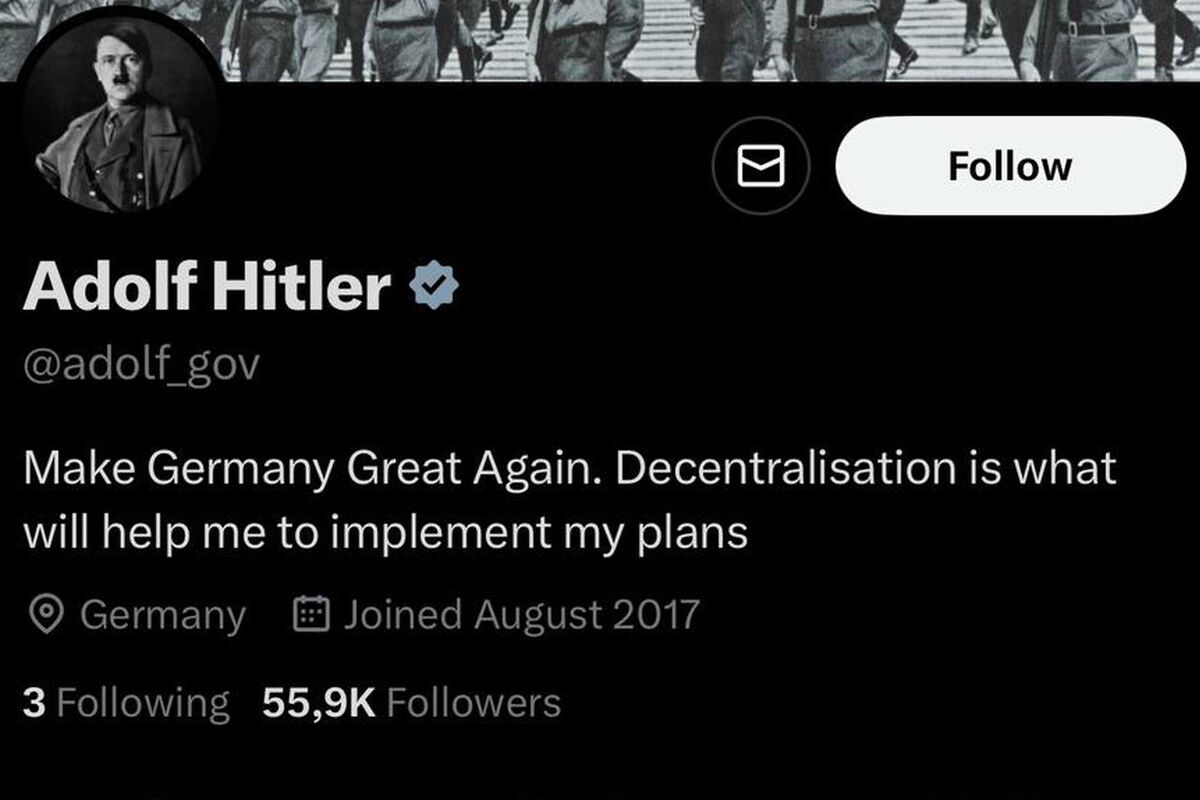 Пользователи соцсети X (бывший Twitter) обратили внимание на аккаунт с верификационной галочкой от имени Адольфа Гитлера. Об этом инциденте написало израильское агентство CursorInfo.