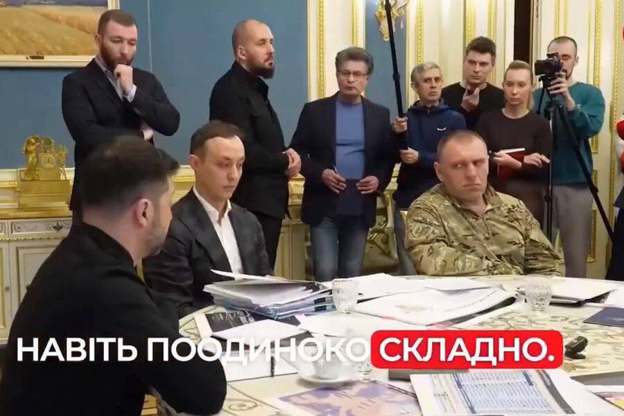 «Украинские военные с радостью слушают доклад Зеленского об их успехах на поле боя. Картина салом на холсте. Неизвестный художник добровольно мобилизован СБУ», — написала она.