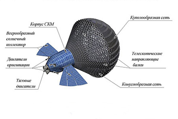 Более экзотические проекты предполагают использование ячеистой сети, — например, такой проект представили инженеры «Российских космических систем». Их аппарат будет ловить не только крупные спутники, но и кубсаты (миниатюрные и экономичные спутники), а также обломки и отработавшие ракетные ступени, с которыми состыковаться крайне трудно. После этого «дворник» измельчит улов в жерновах, превратит его в порошок и использует в качестве компонента топлива, чтобы повысить время активной работы.
