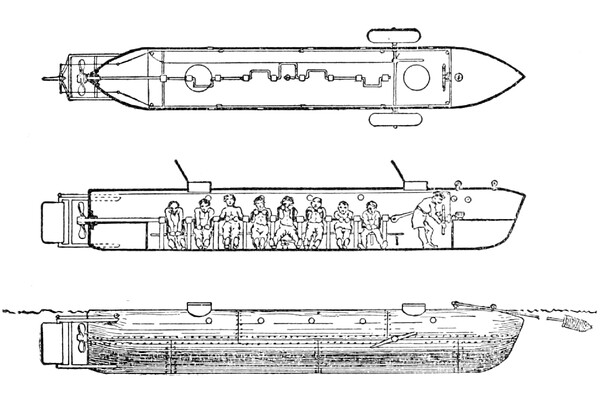 Эта лодка во многом напоминала современные субмарины. Ее корпус, длиной 12 м и шириной 1,2 м, был сделан из стали, а погружение осуществлялось за счет балластных цистерн, которые затапливали через клапаны, а осушали ручными насосами. В движение судно приводил гребной винт, за которым располагался руль.