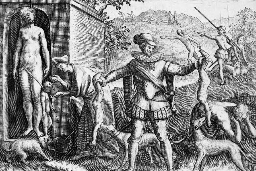 Испанский солдат скармливает собакам убитых индейских женщин и детей. Голландская пропагандистская гравюра эпохи войны против Испании