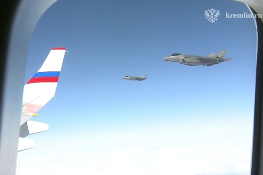 Американские истребители F-22 сопроводили борт Президента России по пути с Аляски в Россию, 16 августа 2025 года. На этом кадре запечатлен F-35, но F-22 тоже в этом участвовали.