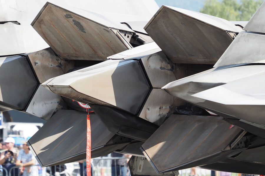 F-22 с тремя раскрытыми отсеками вооружения (одно большое и два маленьких по бокам)