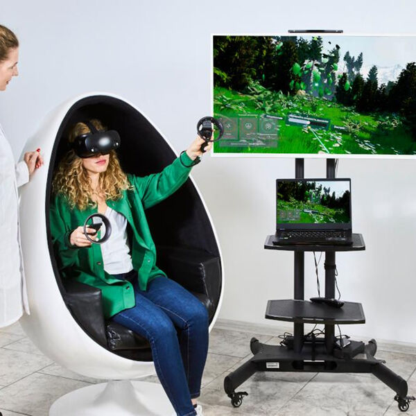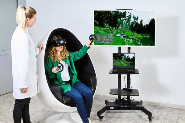 Аудиовизуальный комплекс ФЛОУ включает в себя монитор, VR-очки, наушники, джойстики, кресло специальной конструкции, которая позволяет пациенту максимально расслабиться и не отвлекаться во время реабилитации.