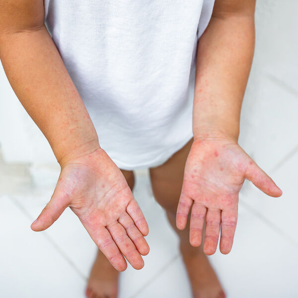 «Отличить его от ОРВИ можно по фирменной «подписи». Если обычное ОРВИ — это в основном синдром верхних дыхательных путей – насморк, боль в горле, кашель, – то для Коксаки характерен синдром «рука-нога-рот»: маленькие пузырьки (везикулы) и язвочки (афты) на слизистой рта, а также на ладонях, пальцах рук, подошвах, стопах. Красная пятнистая сыпь и пузырьки не зудят, но могут быть болезненными», – рассказал врач.