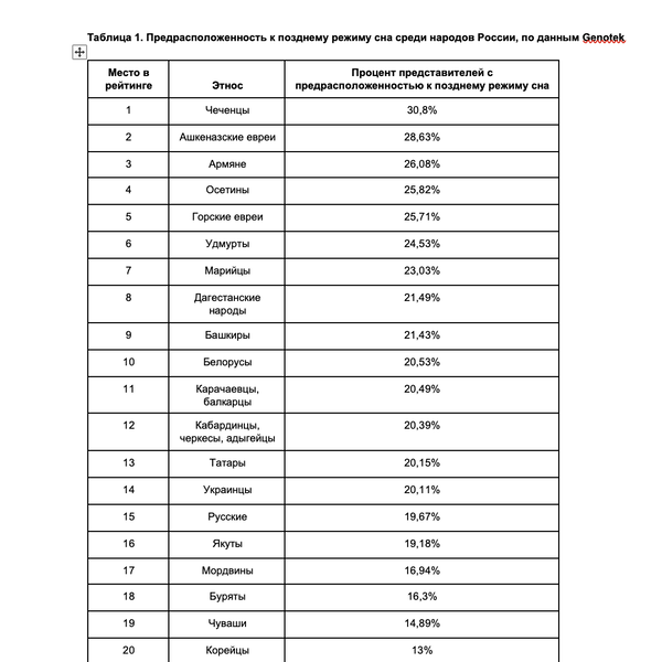 Ученые проанализировали распространенность вариаций гена PER3 среди различных народов, эти вариации связаны со склонностью к определенному режиму сна. В результате было выявлено, что среди чеченцев (30,8%) чаще встречаются люди, предрасположенные к позднему режиму сна, на втором месте — ашкеназские евреи (28,63%), а на третьем — армяне (26,08%). Наименьшая доля «сов», склонных к поздним подъемам, наблюдается у азербайджанцев (12,21%), казахов (12,69%) и корейцев (13%).