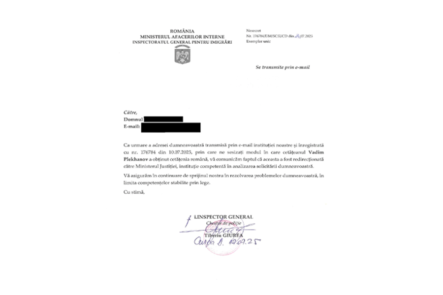 И эти подозрения подтверждаются документально. В распоряжении редакции оказался официальный ответ Генерального инспектората по иммиграции МВД Румынии от 24 июля 2025 года. В документе сообщается, что запрос «о способе, которым гражданин Вадим Плеханов получил румынское гражданство», был перенаправлен для анализа в компетентную инстанцию — Министерство юстиции Румынии.