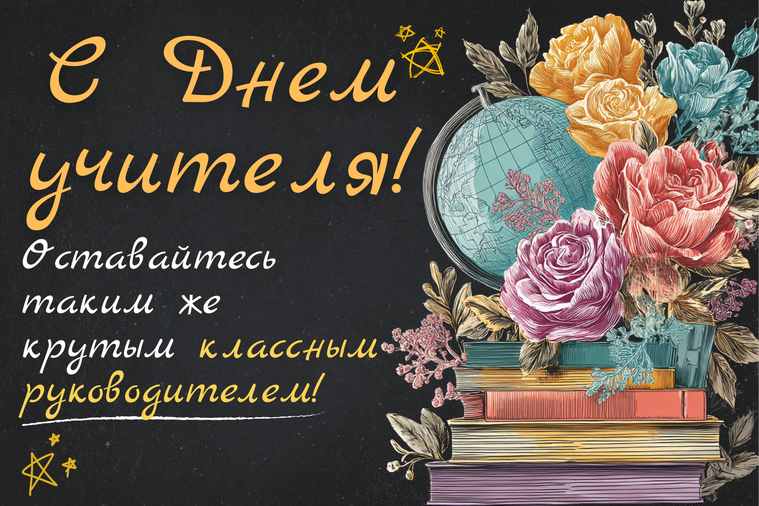 Наш(а) классный руководитель, с Днем учителя! Спасибо, что терпите наше «веселье», вечные опоздания и шумные перемены. Знайте, мы ценим ваш труд и ваше огромное сердце! Обещаем стараться радовать вас чаще. Крепкого вам здоровья и больше спокойствия!