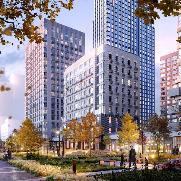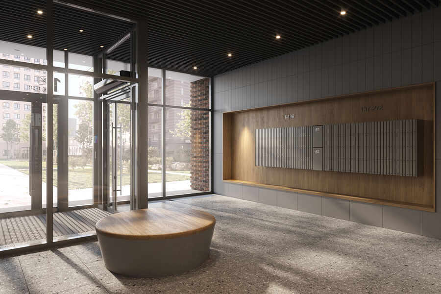 На первых этажах — благоустроенные торговые аллеи, где есть стильные кафе с большими витринами и магазины, а рядом — оригинальные игровые пространства-плейхабы и многофункциональные спортивные зоны с индивидуальным дизайном.