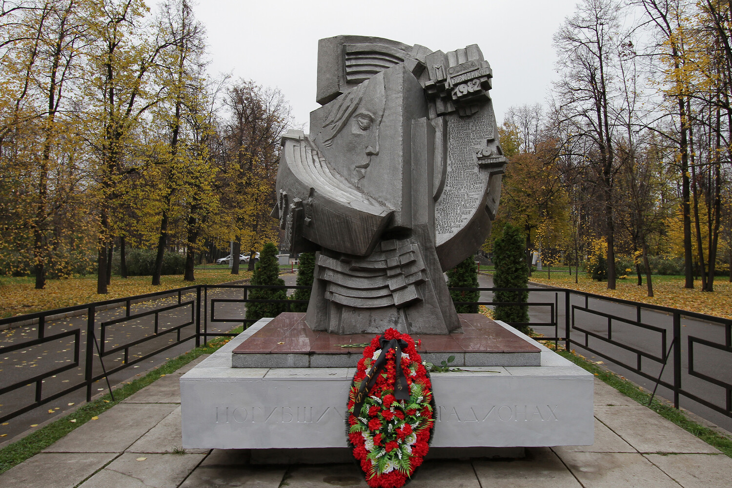 Памятник футбольным болельщикам, погибшим 20 октября 1982 года во время матча между ФК «Спартак» Москва (СССР) и ФК «Хаарлем» (Нидерланды), установленный на БСА «Лужники» в Москве
