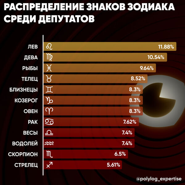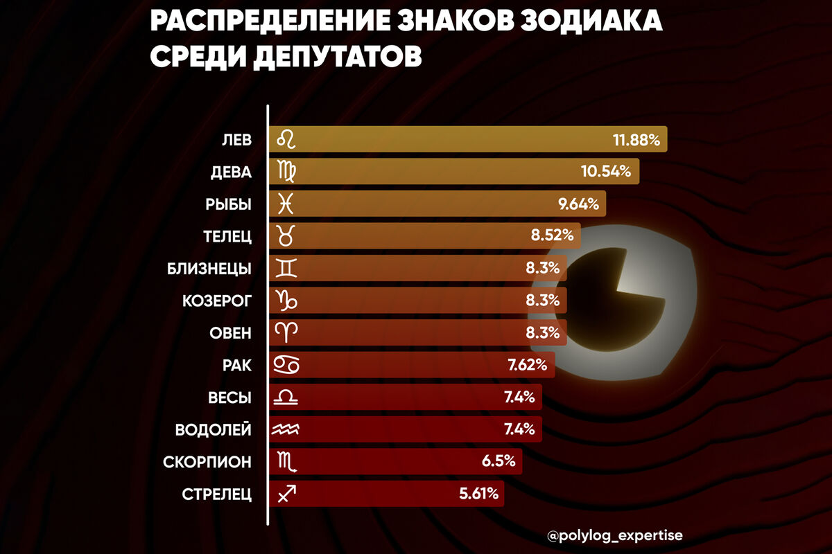 Важно отметить, что распределение лидерства среди знаков зодиака депутатов Госдумы текущего созыва практически не изменилось по сравнению с Думой прошлого созыва. И это при том, что восьмой созыв обновился более чем на 50%.
