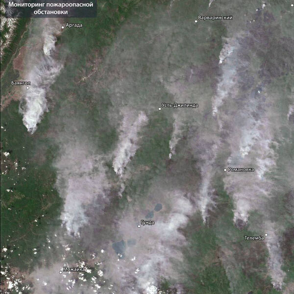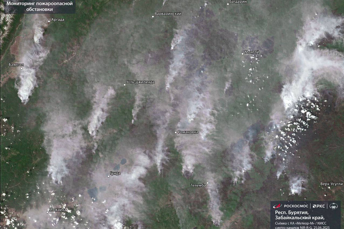 Госкорпорация «Роскосмос» опубликовала в своем Telegram-канале спутниковый снимок пожаров в Забайкальском крае и Республике Бурятия.