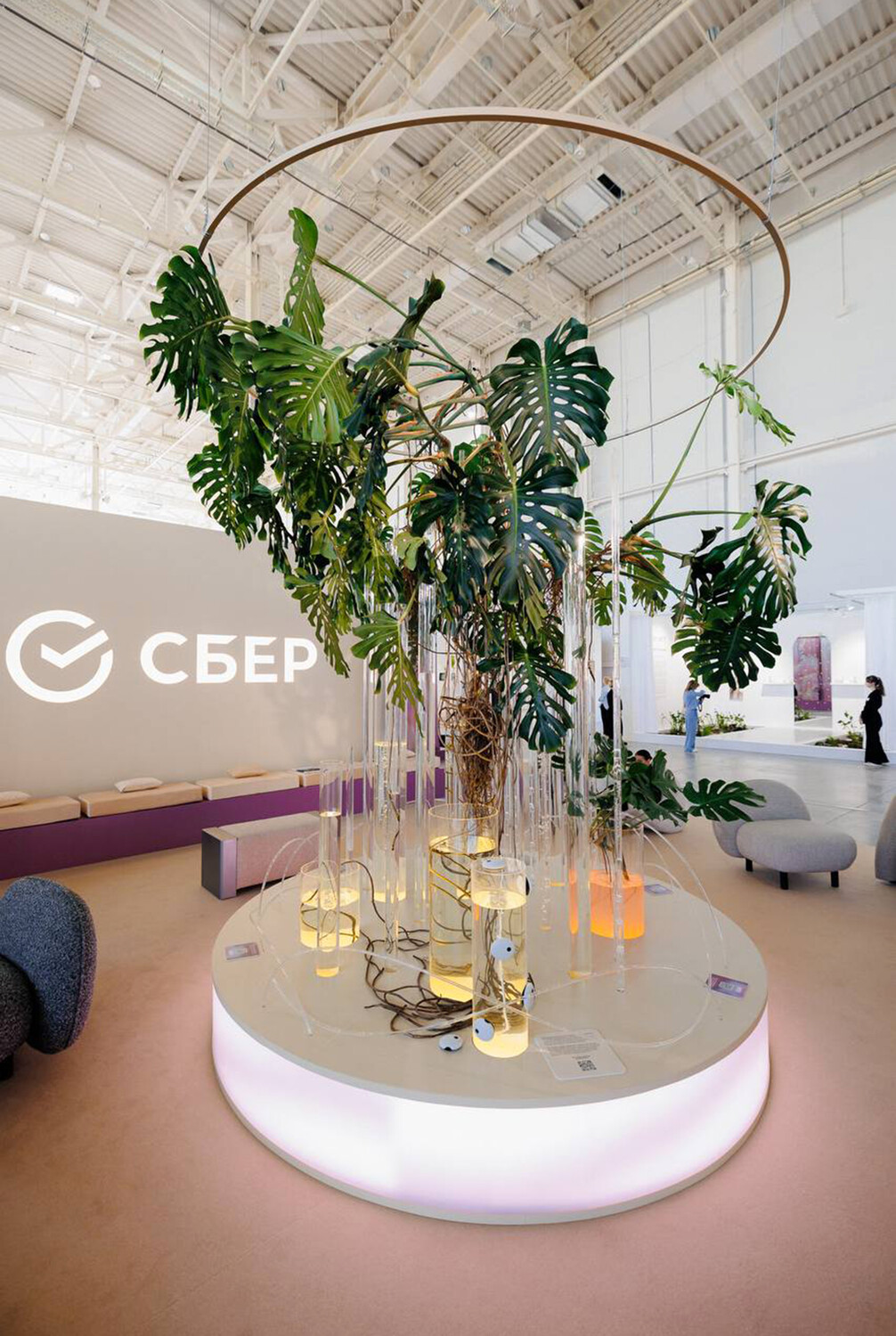 Объект превращает идею умной экосистемы в зримую форму: легкие вертикальные колонны создают эффект невидимой опоры, по прозрачным каналам бегут пузырьки-данные. В окружающую среду встроена умная колонка SberBoom Micro, с которой можно побеседовать о философии, природе и будущем. И даже дизайн драпировок сгенерирован с помощью нейросети Kandinsky.