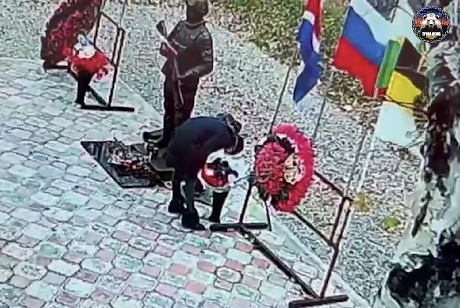 На кадрах с места инцидента заметно, как женщина пытается поджечь стоящие в вазе цветы. После этого она взяла несколько предметов около основания памятника и разбила их. Затем пинала элементы мемориала и светильники по краям от дороги, ведущей к нему.