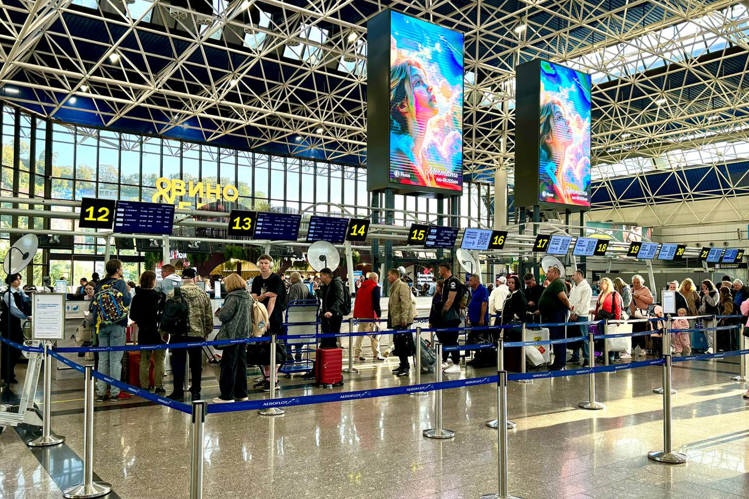 На текущий момент задержаны вылеты 26 рейсов, добавили в аэропорту. Задержки составляют как минимум два часа. Людей попросили уточнять статус рейса через колл-центры и сайты авиаперевозчиков, на табло аэропорта в терминале, а также бот в Telegram.
