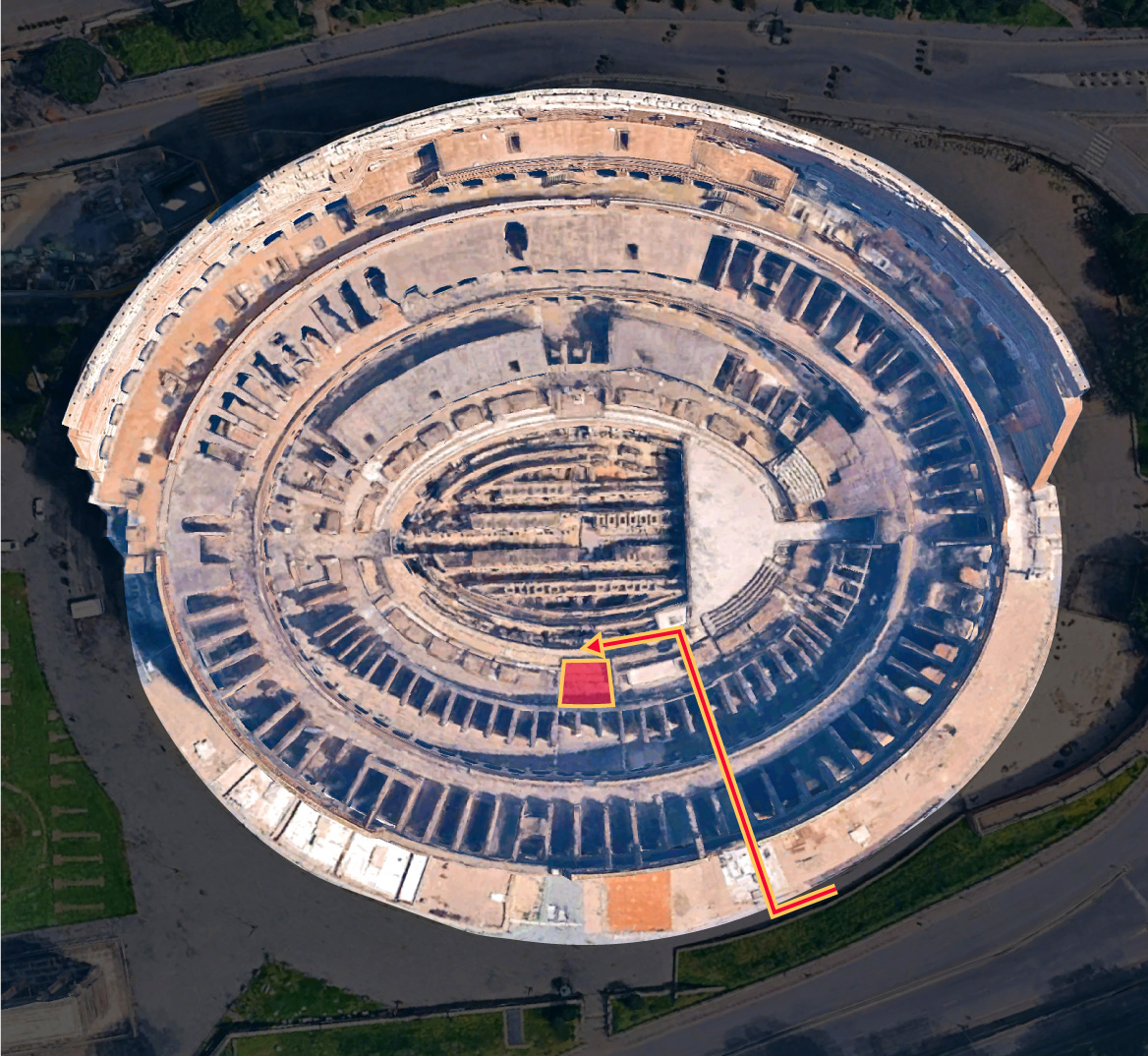 Считается, что туннель начинался у императорской ложи, проходил под трибунами и выводил на южный край Колизея, обеспечивая тайный выход. По предположениям археологов, он также соединял амфитеатр с Ludus Magnus — школой гладиаторов, где император мог посещать бойцов перед выступлениями.