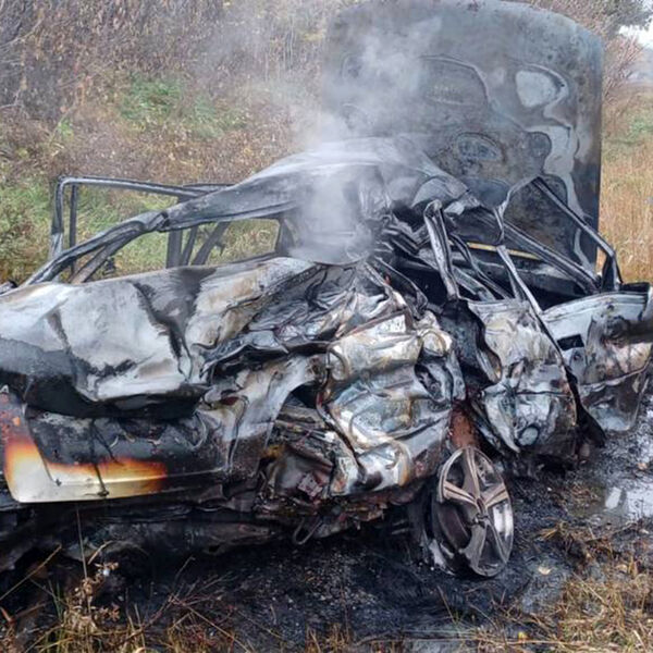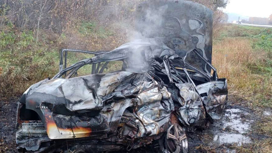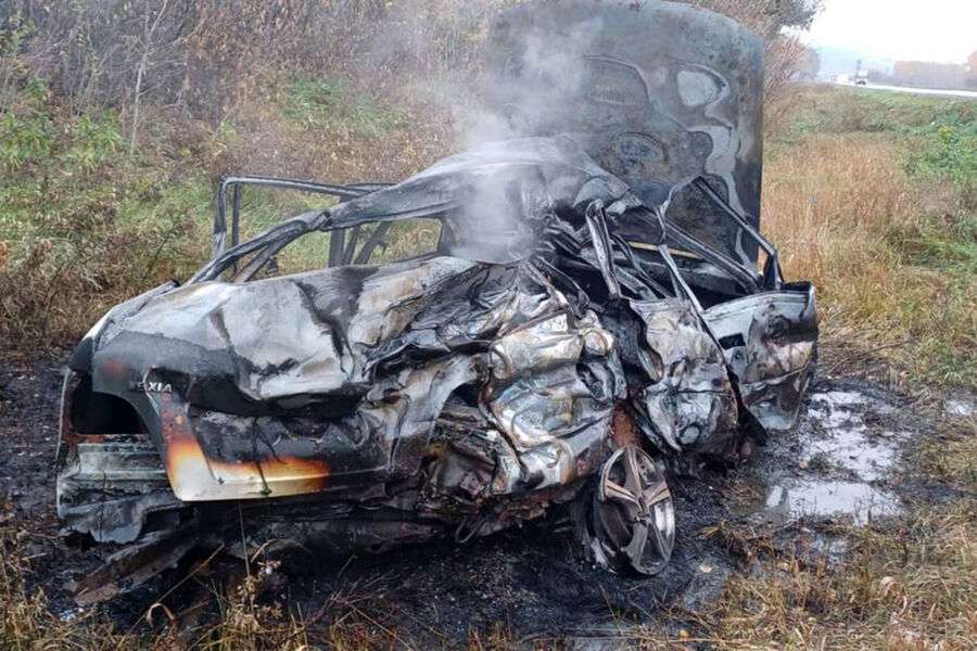 В результате легковая машина вылетела с дороги, опрокинулась в кювет и загорелась. На кадрах с места инцидента заметно, что во время аварии автомобиль смяло, Серьезные повреждения получила крыша.