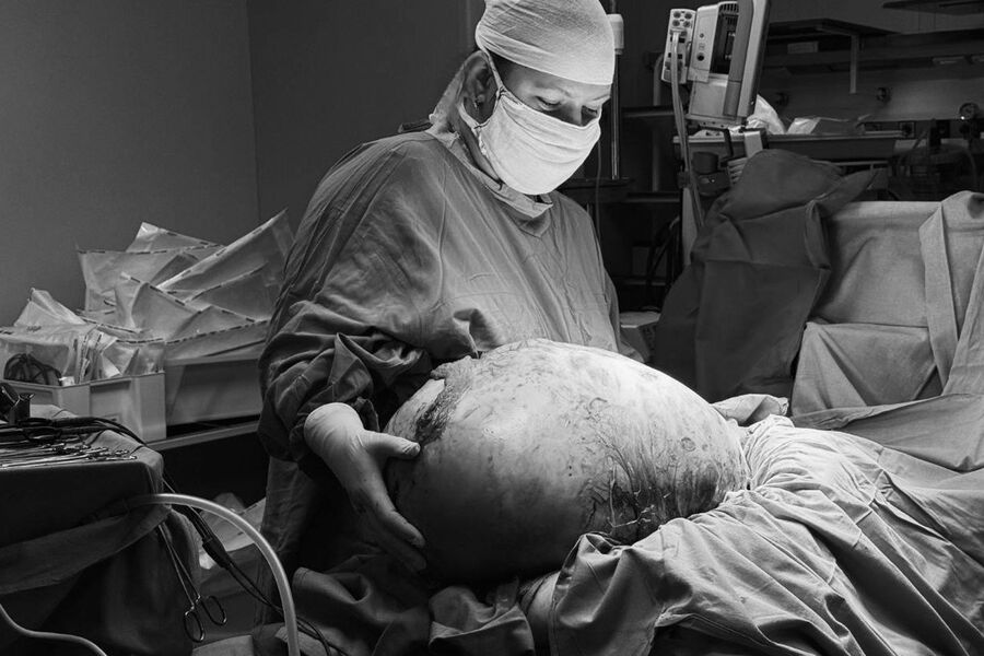 Женщина самостоятельно обратилась к врачам — ее беспокоили слабость и живот, который существенно увеличился в размерах. В ходе обследования у нее нашли гигантскую опухоль брюшной полости и малого таза. Размер образования в диаметре составлял около 50 сантиметров. Вес опухоли составил 20 килограммов.