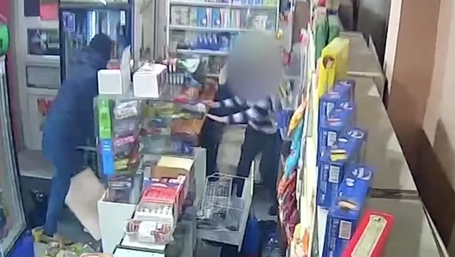 Работница магазина бьет агрессора по голове пакетом и прогоняет его со словами «Пошел вон». Грабитель предпринимает еще одну попытку добраться до выручки, но продавец вновь встает на его пути. В итоге мужчина ушел с «добычей» в виде четырех пачек сигарет.