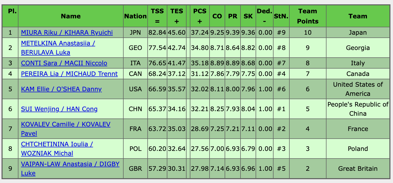 Итоги выступления спортивных пар в короткой программе: