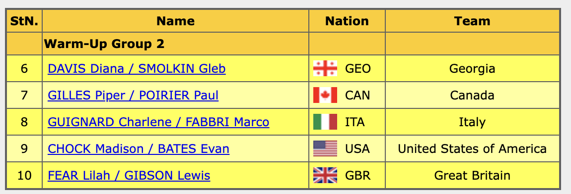 Порядок выступления спортивных пар: